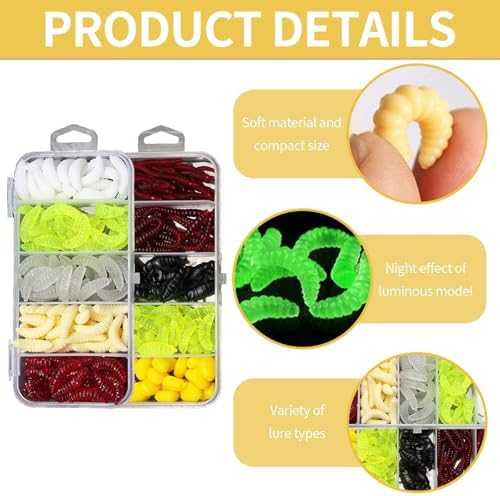 Gusanos luminosos brillan en profundidades atrayendo nocturnos. Suaves artificiales flexan en corrientes imitando vivos. Cebos variados adaptan a especies diversas. Caja set organiza para kits completos. Para dulce salada en lagos o mares. Facilita salidas preparadas. Versátil en cebos glow. Mejora picadas en oscuridades. Reduce visibilidades bajas. Perfecto para nocturnos cazadores.